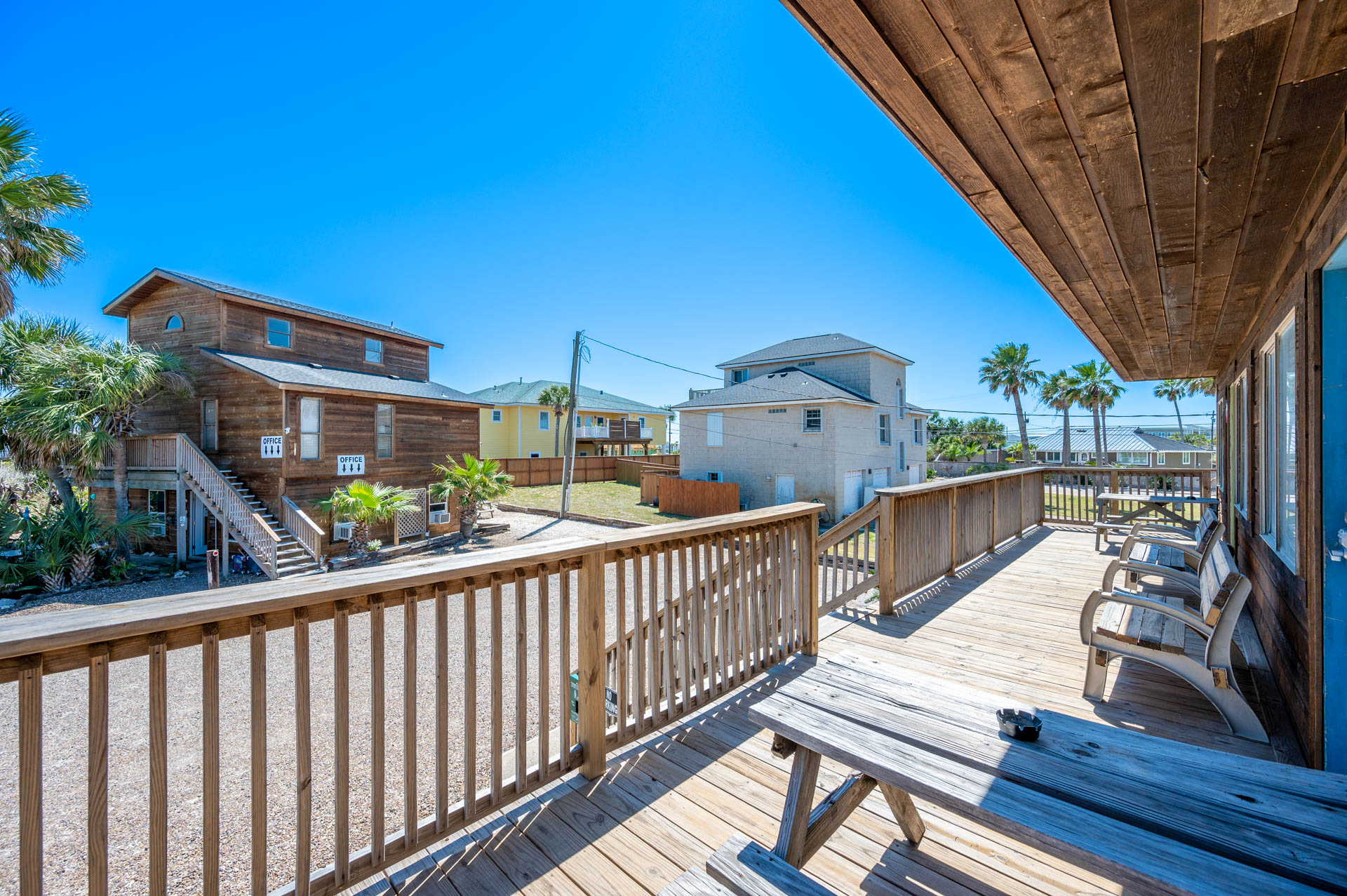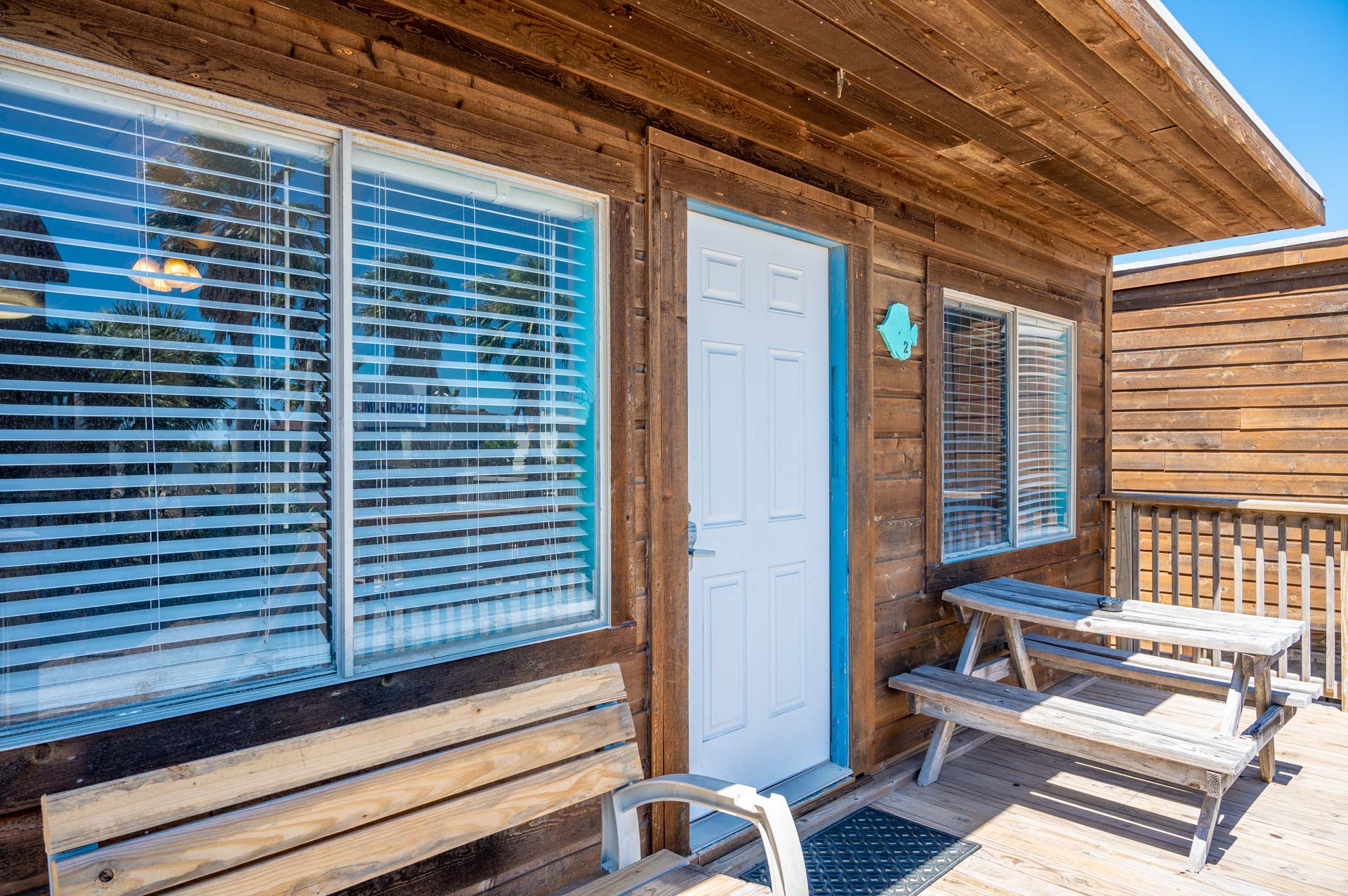 his room is located on the 2nd floor. It has a spacious uncovered deck overlooking the parking lot. A picnic table and bench make for a great place to relax after a day at the beach or to catch the sunrise or evening breezes. There are also some towels hooks to dry out your bathing suits or beach towels. This deck area is shared with Room 1.