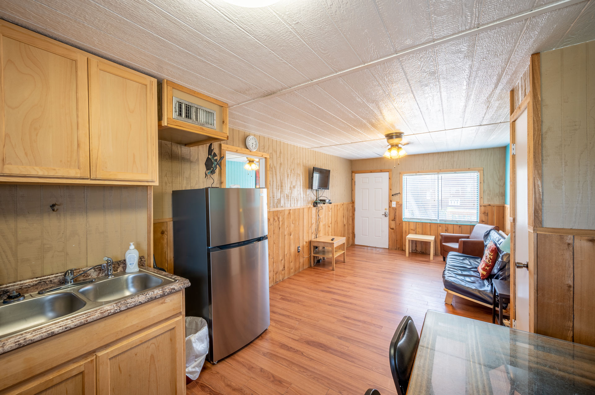 The living room has large windows and is open to the kitchen. There is a chair and a futon that folds down to make a double bed. A ceiling fan helps keep the breeze moving along with a flat panel TV with standard cable to enjoy during your stay. This unit has Central A/C heating.