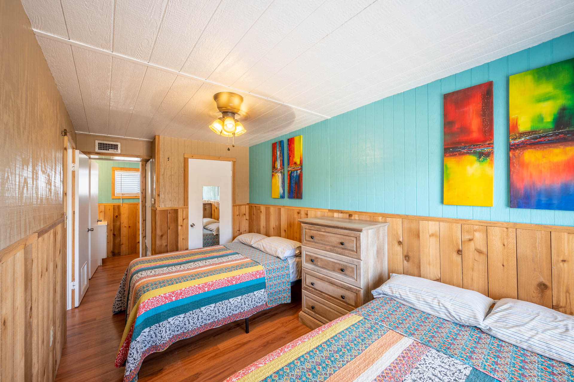 This bedroom has large windows that let in a lot of light and 2 Double sized beds plus a ceiling fan to keep the air moving. A small closet is available to hang your clothes and store your luggage along with a dresser if you wish to unpack. The bathroom is accessible from the bedroom.