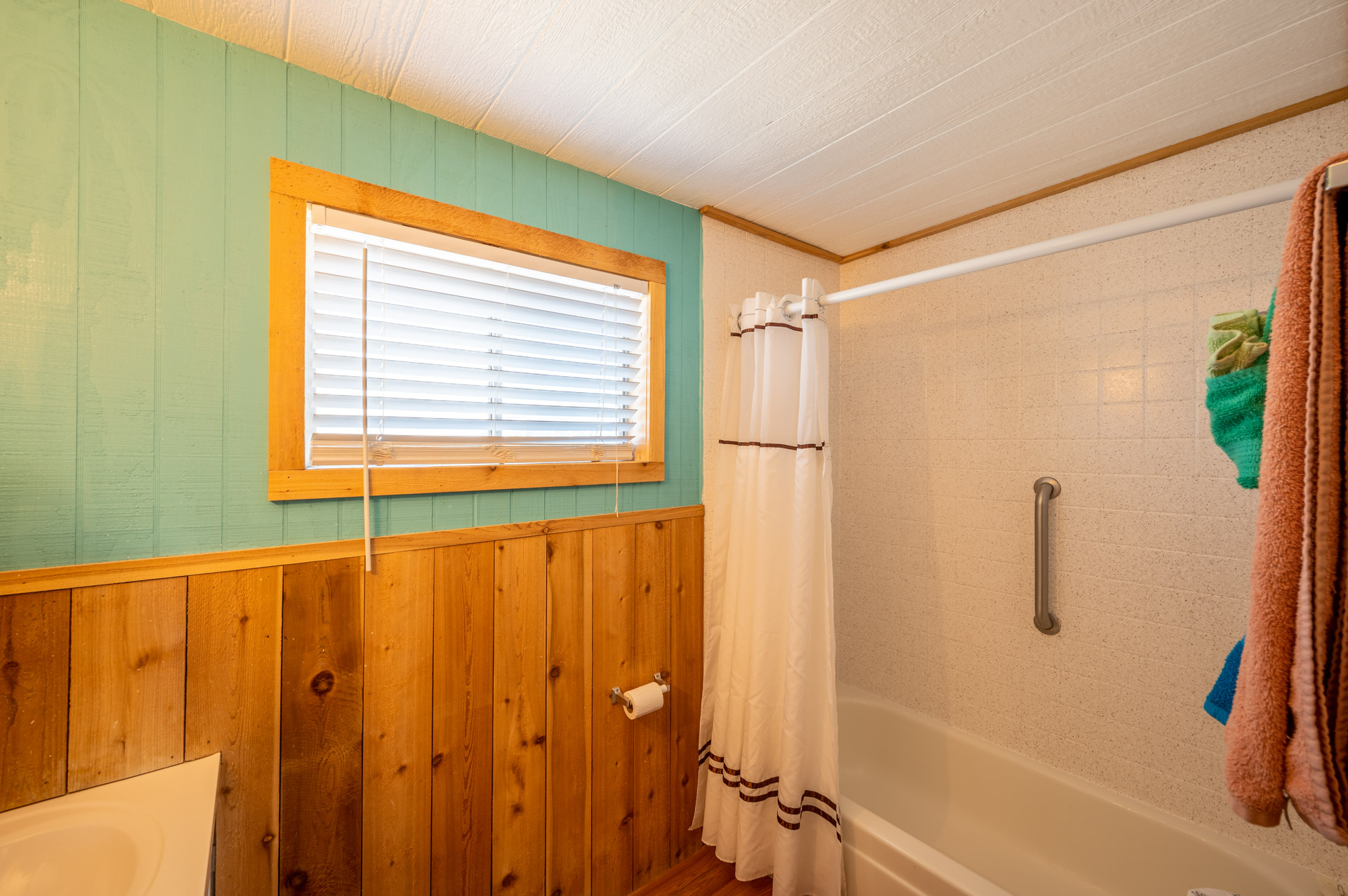 Accessible from the bedroom, the bathroom is a good size with a tub/shower combo to wash off after a day at the beach. There is a small window to let in extra light plus a sink and vanity with extra storage and a mirror to help you get ready for the day.